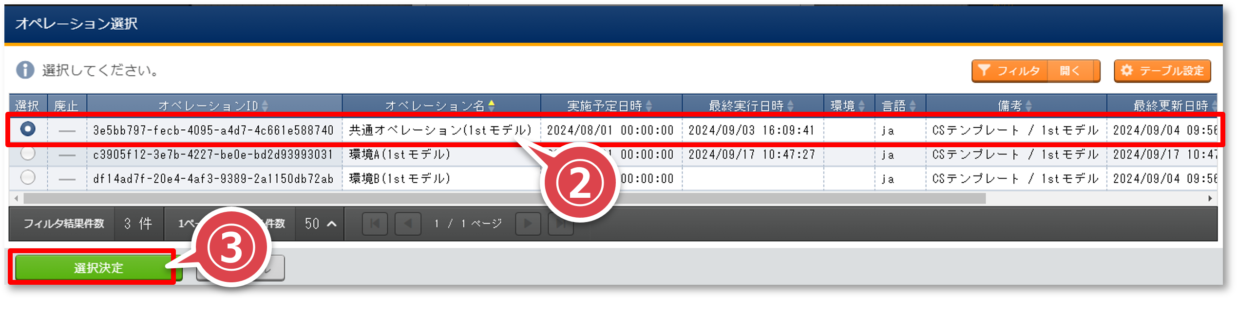 「オペレーション選択」ポップアップ画面の”共通オペレーション”のレコードを選択して「選択決定」ボタンを押下する