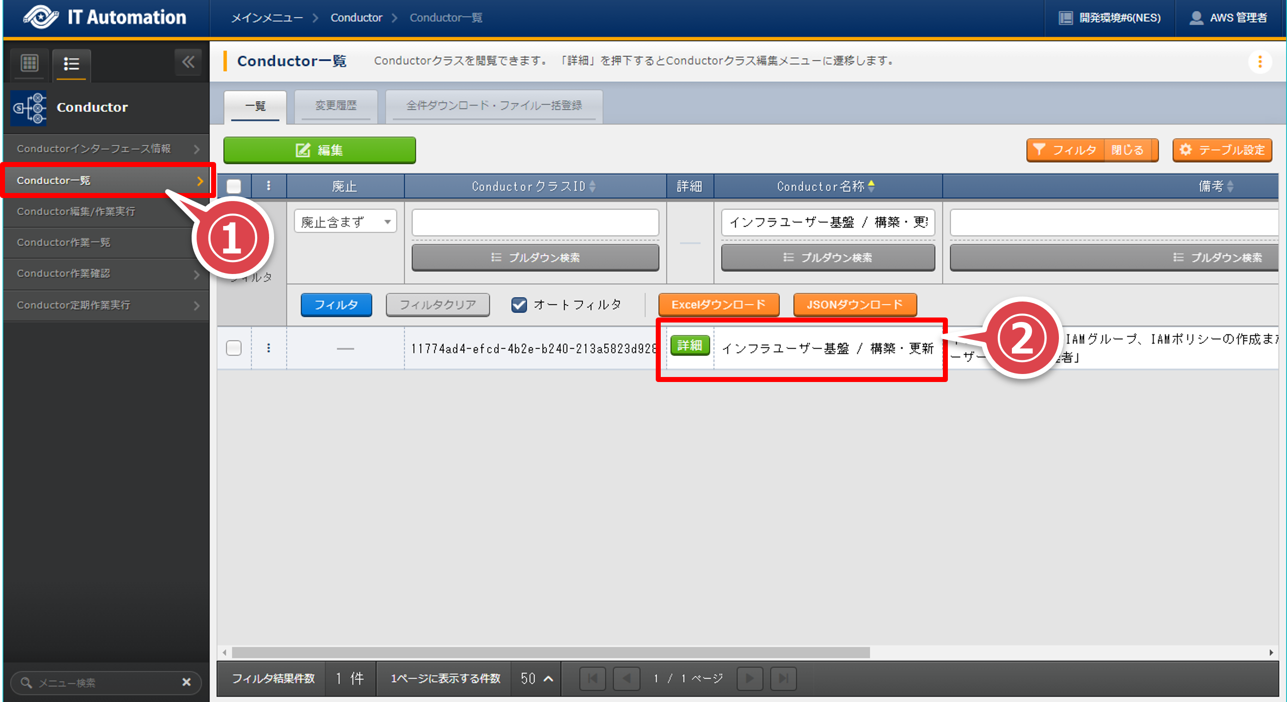 「Conductor一覧」画面の「Conductor名称」が”インフラユーザー基盤 / 構築・更新”のレコードの「詳細」ボタンを押下する。 フィルタの「Conductor名称」で検索すると間違いがない