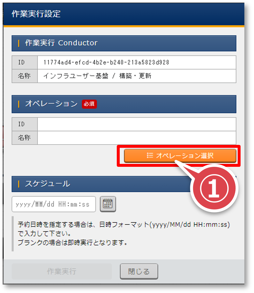 「作業実行設定」ポップアップ画面の「オペレーション選択」ボタンを押下する