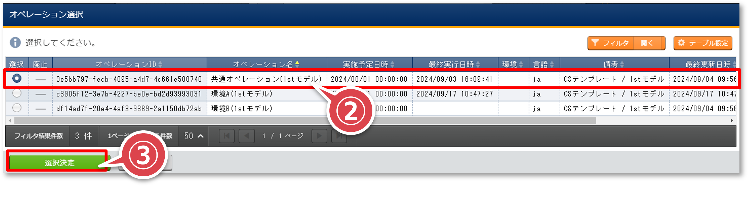 「オペレーション選択」ポップアップ画面の”共通オペレーション”のレコードを選択して「選択決定」ボタンを押下する