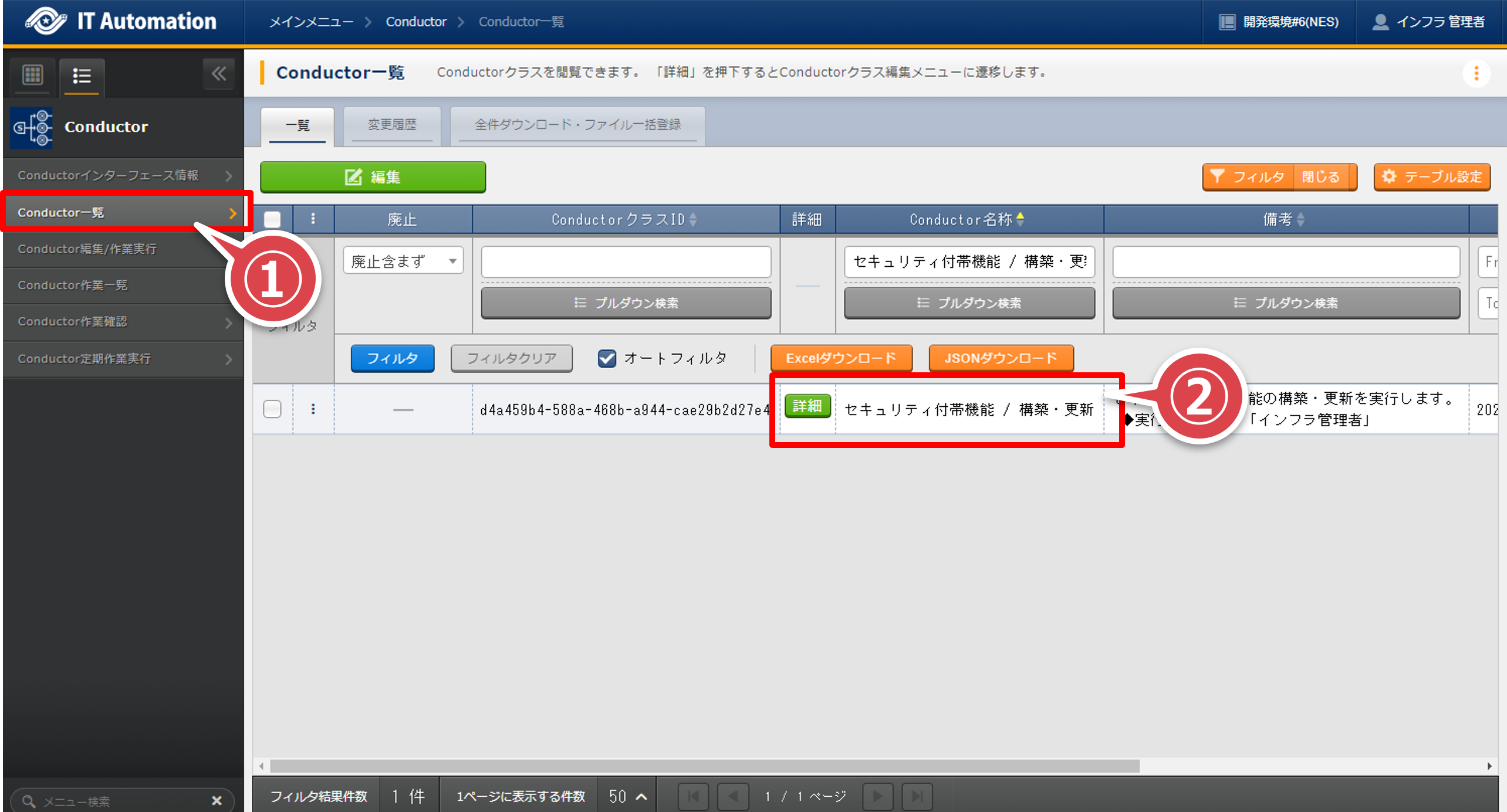 - 「Conductor一覧」画面の「Conductor名称」が”セキュリティ付帯機能 / 構築・更新”のレコードの「詳細」ボタンを押下する。フィルタの「Conductor名称」で検索すると間違いがない