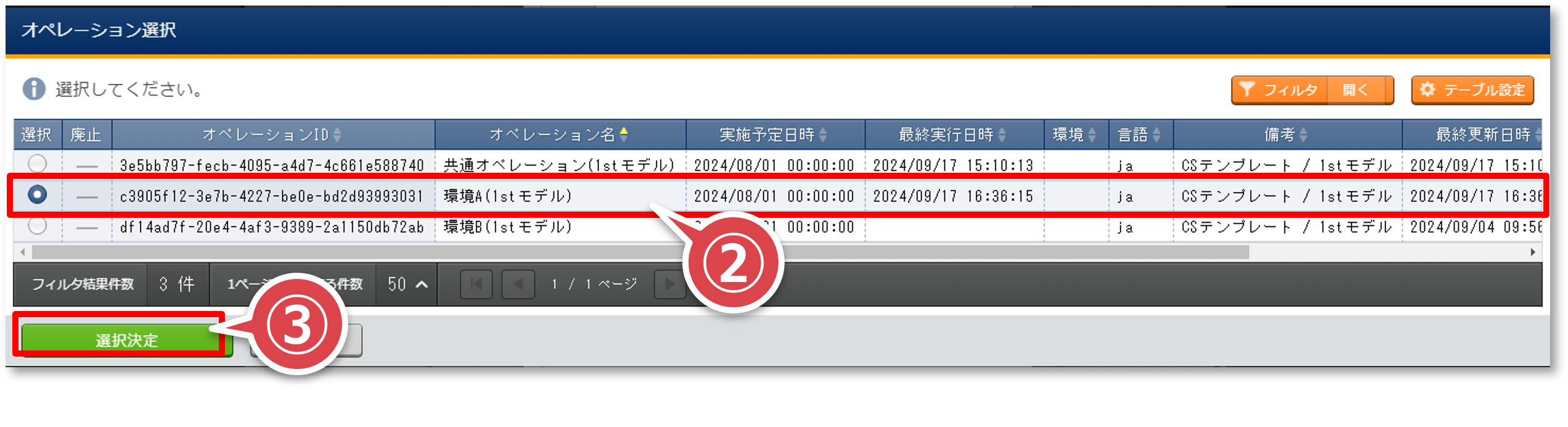 「オペレーション選択」ポップアップ画面の”環境A(1stモデル)”のレコードを選択して「選択決定」ボタンを押下する