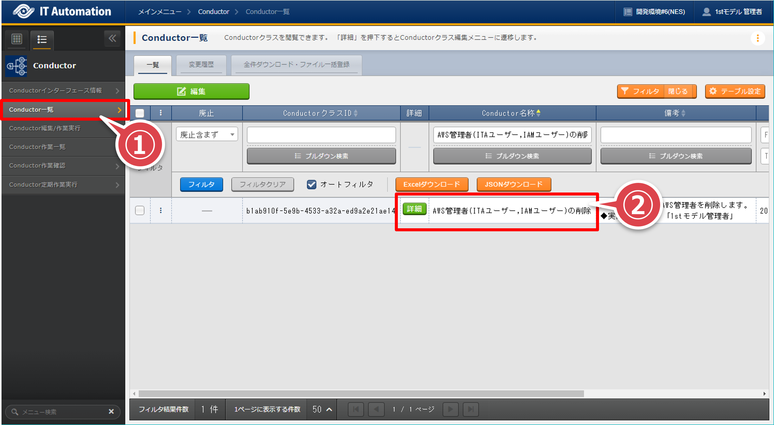 - 「Conductor一覧」画面の「Conductor名称」が”AWS管理者(ITAユーザー,IAMユーザー)の削除”のレコードの「詳細」ボタンを押下する。フィルタの「Conductor名称」で検索すると間違いがない