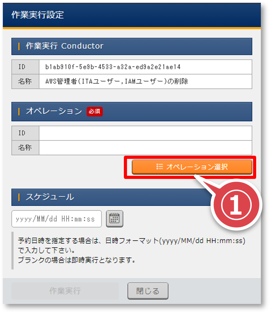 「作業実行設定」ポップアップ画面の「オペレーション選択」ボタンを押下する