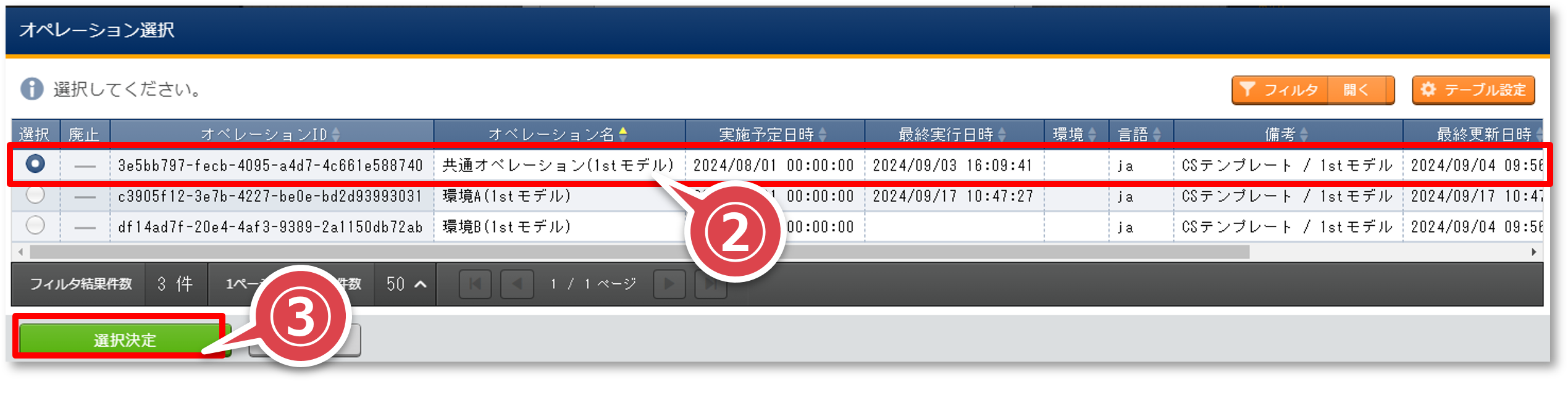 「オペレーション選択」ポップアップ画面の”共通オペレーション”のレコードを選択して「選択決定」ボタンを押下する