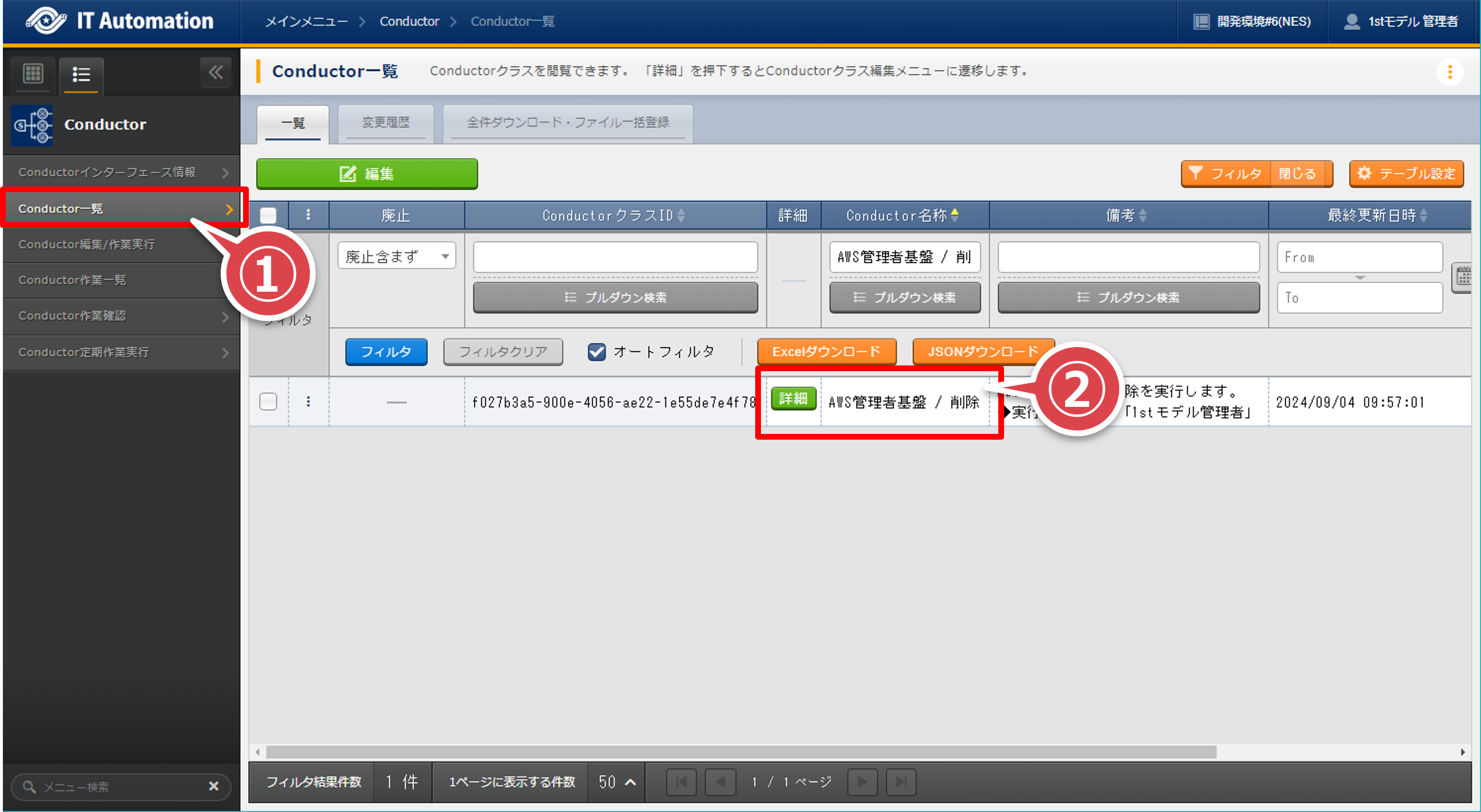 - 「Conductor一覧」画面の「Conductor名称」が”AWS管理者基盤 / 削除”のレコードの「詳細」ボタンを押下する。フィルタの「Conductor名称」で検索すると間違いがない