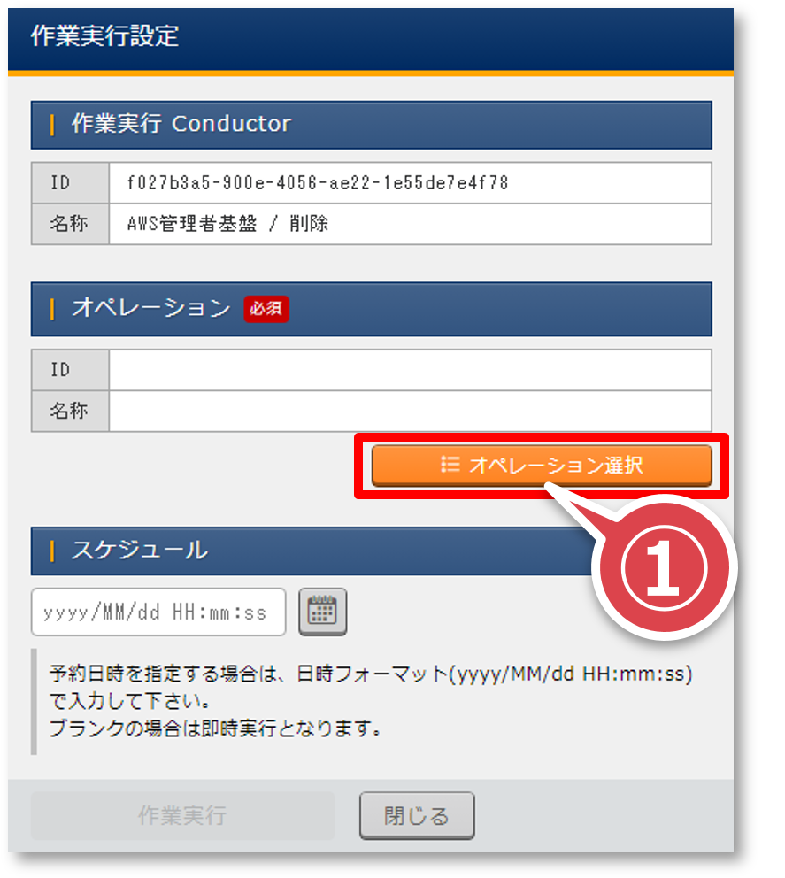 「作業実行設定」ポップアップ画面の「オペレーション選択」ボタンを押下する